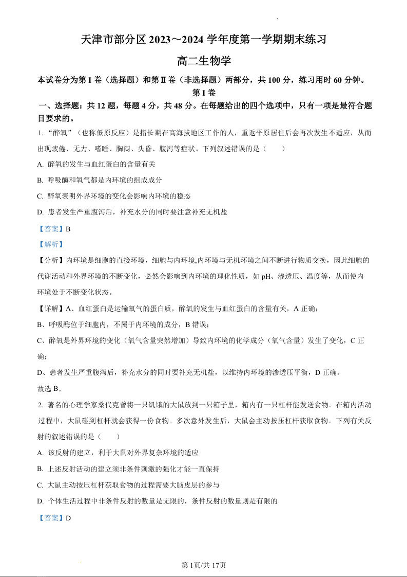 天津市部分地区2023-2024学年高二上学期期末考试生物(精品解析版)