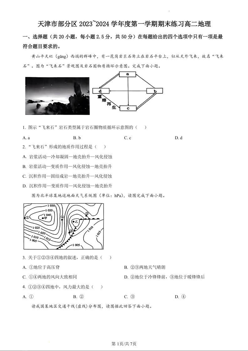 天津市部分地区2023-2024学年高二上学期期末考试地理(原卷版)
