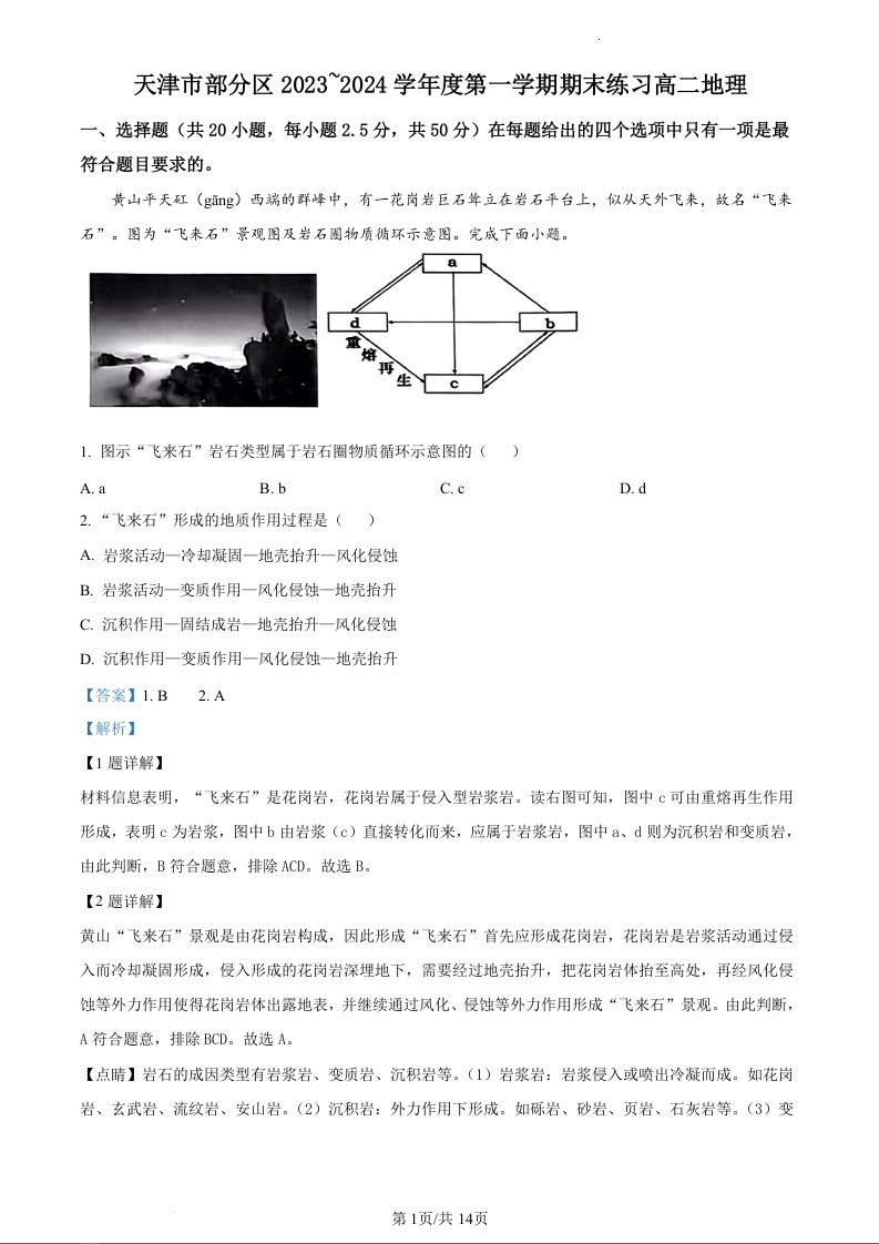 天津市部分地区2023-2024学年高二上学期期末考试地理(精品解析版)