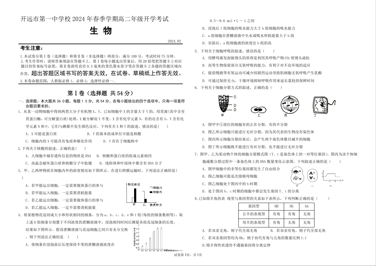 云南省开远市第一中学校2023-2024学年高二下学期开学考试生物