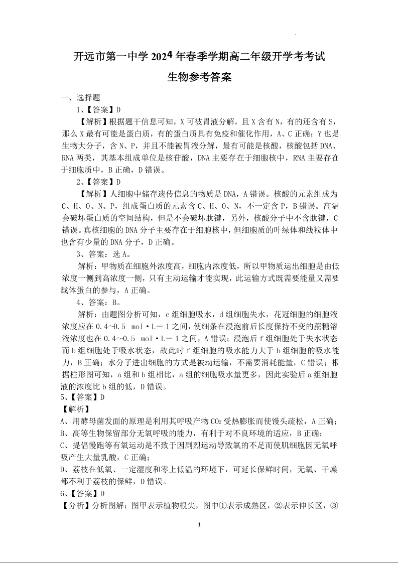 云南省开远市第一中学校2023-2024学年高二下学期开学考试生物答案