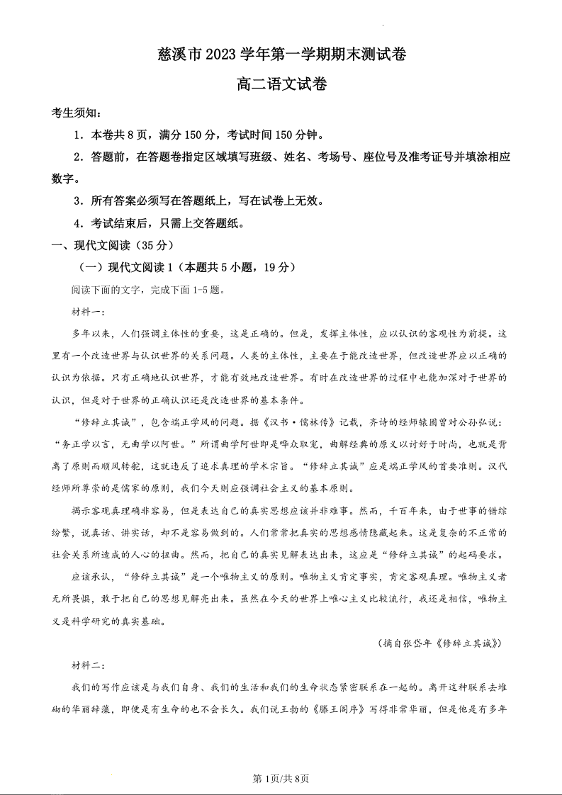 浙江省慈溪市2023-2024学年高二上学期期末测试语文(原卷版)