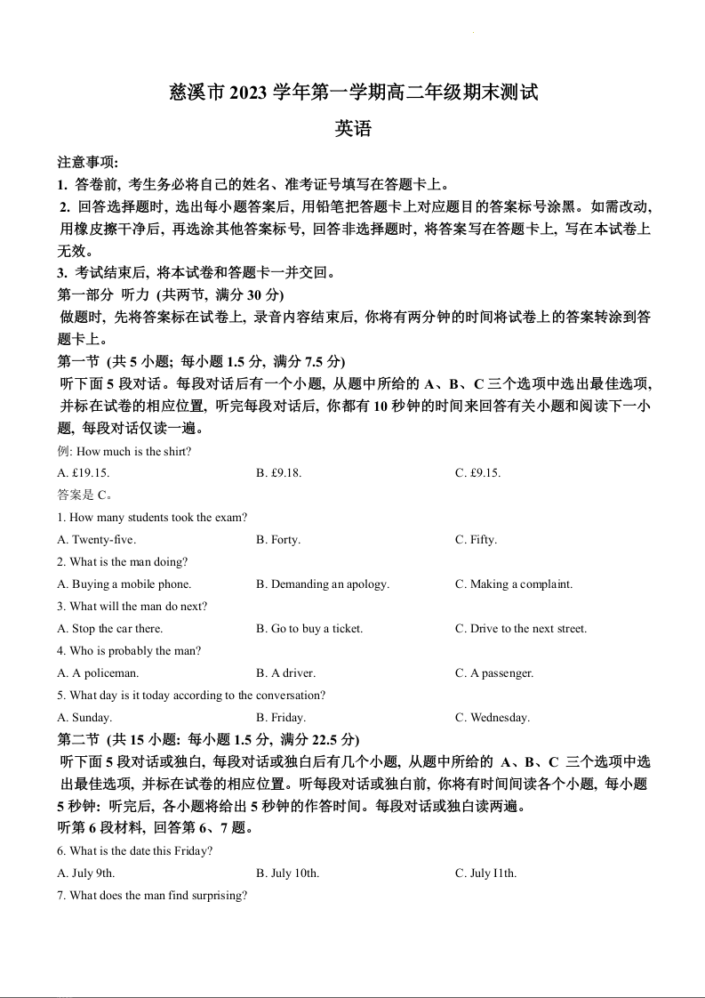 浙江省慈溪市2023-2024学年高二上学期期末测试英语+答案