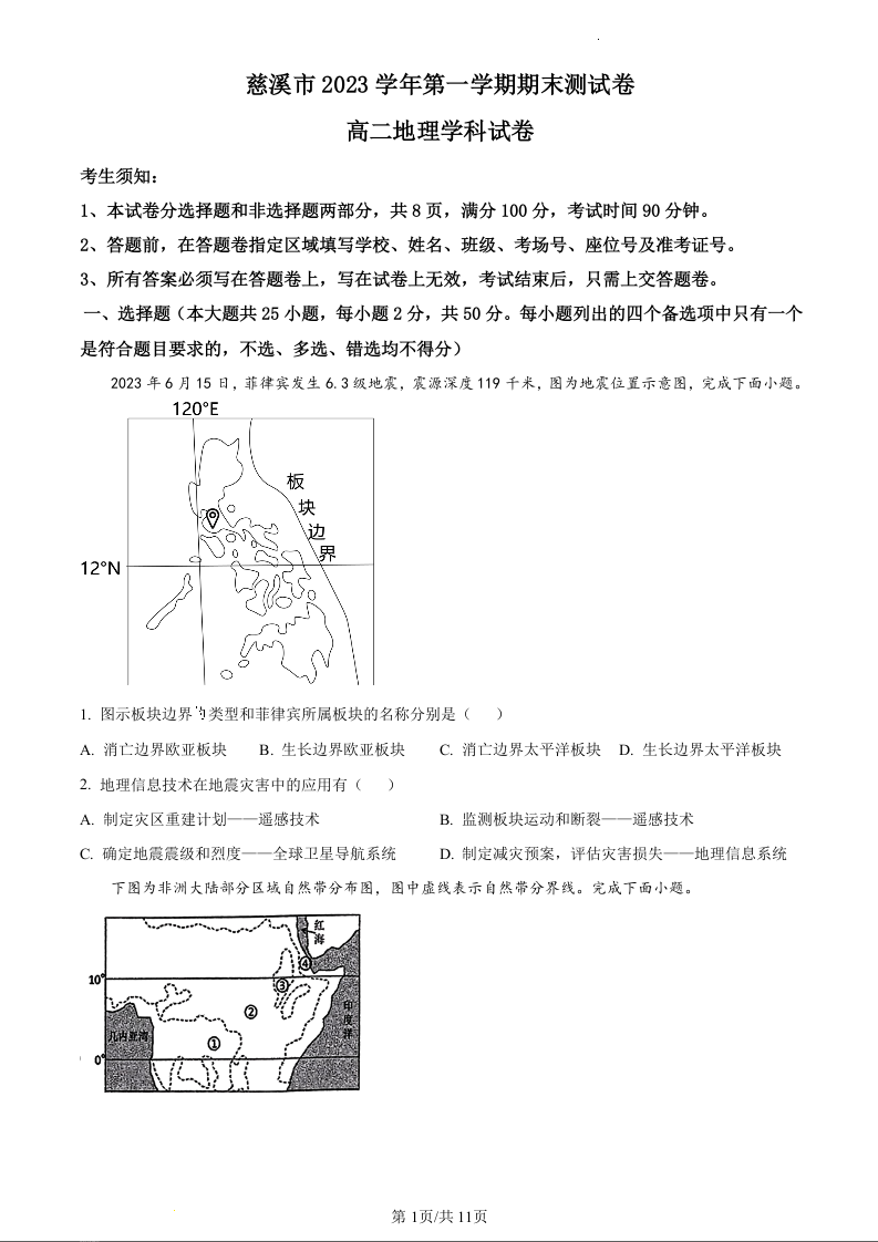 浙江省慈溪市2023-2024学年高二上学期期末测试地理(原卷版)