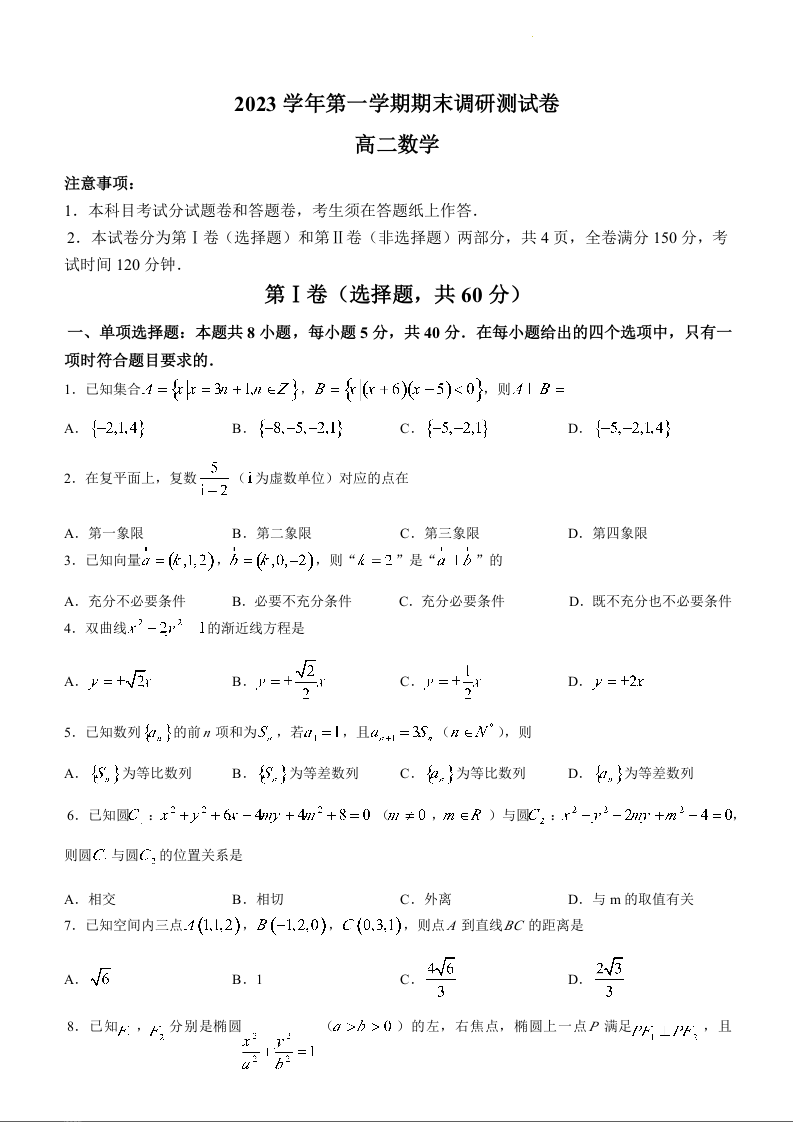 浙江省湖州市2023-2024学年高二上学期1月期末考试数学+答案