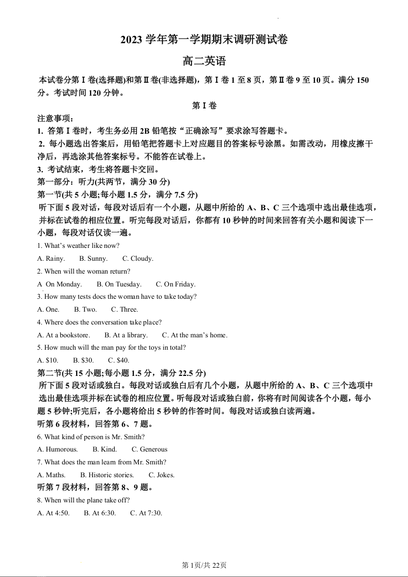 浙江省湖州市2023-2024学年高二上学期1月期末考试英语(精品解析版)