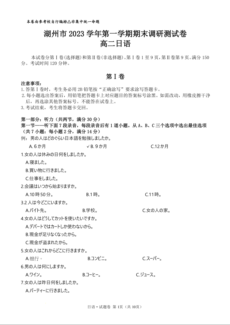 浙江省湖州市2023-2024学年高二上学期1月期末考试日语