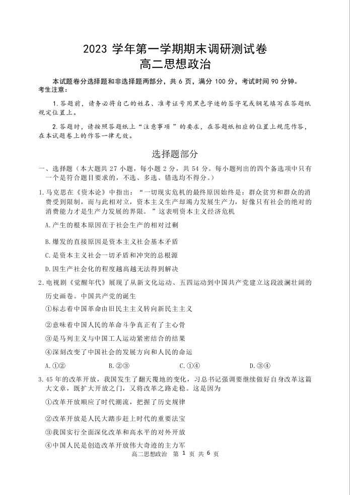 浙江省湖州市2023-2024学年高二上学期1月期末考试政治
