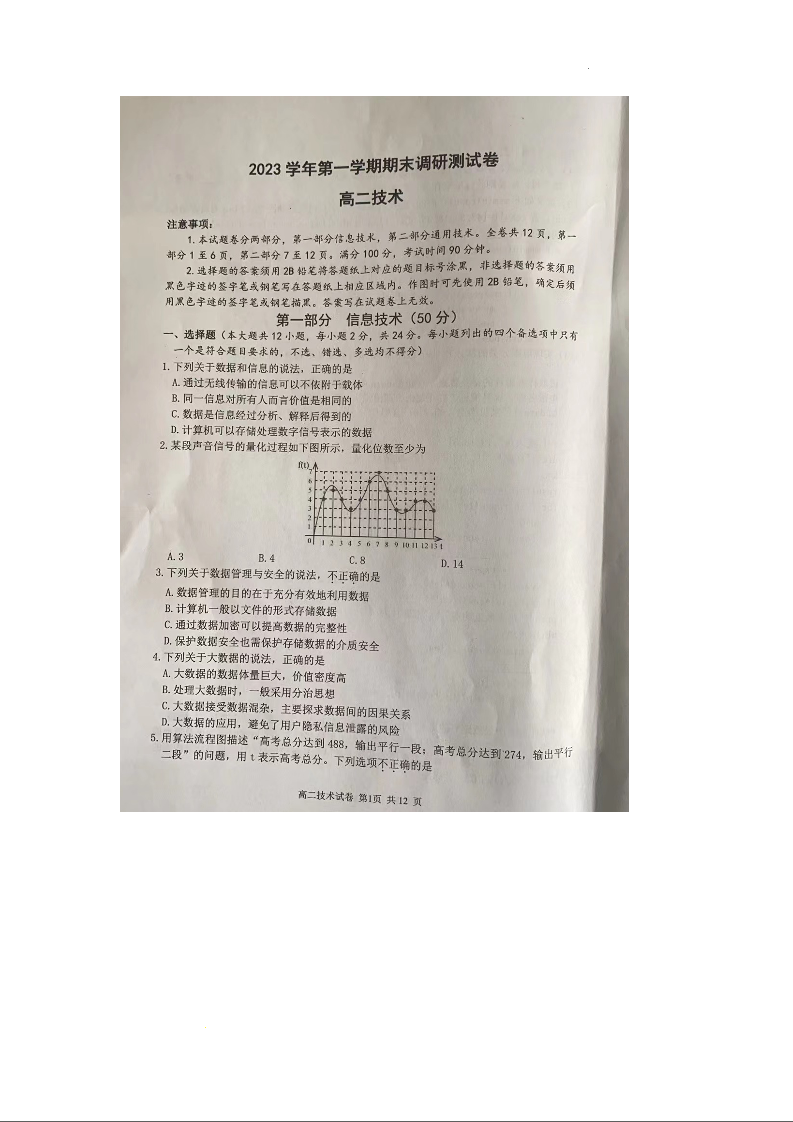 浙江省湖州市2023-2024学年高二上学期1月期末考试技术+答案