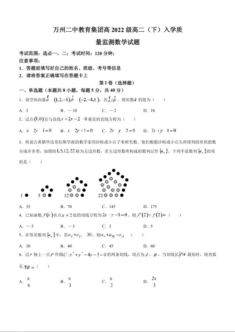 重庆市万州二中教育集团2023-2024学年高二下学期入学质量监测数学+答案