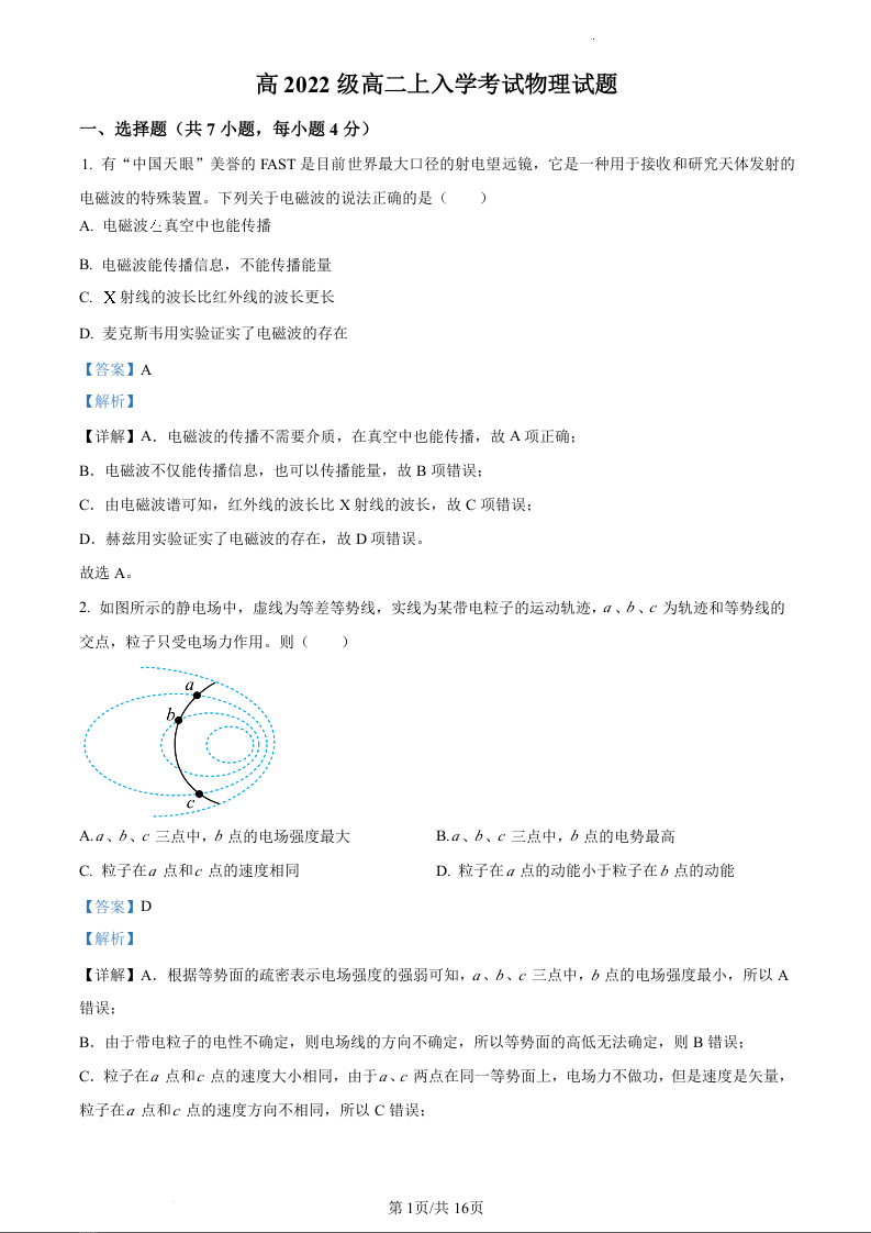 重庆市万州二中教育集团2023-2024学年高二下学期入学质量监测物理(精品解析版)