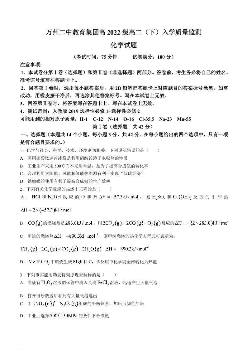 重庆市万州二中教育集团2023-2024学年高二下学期入学质量监测化学