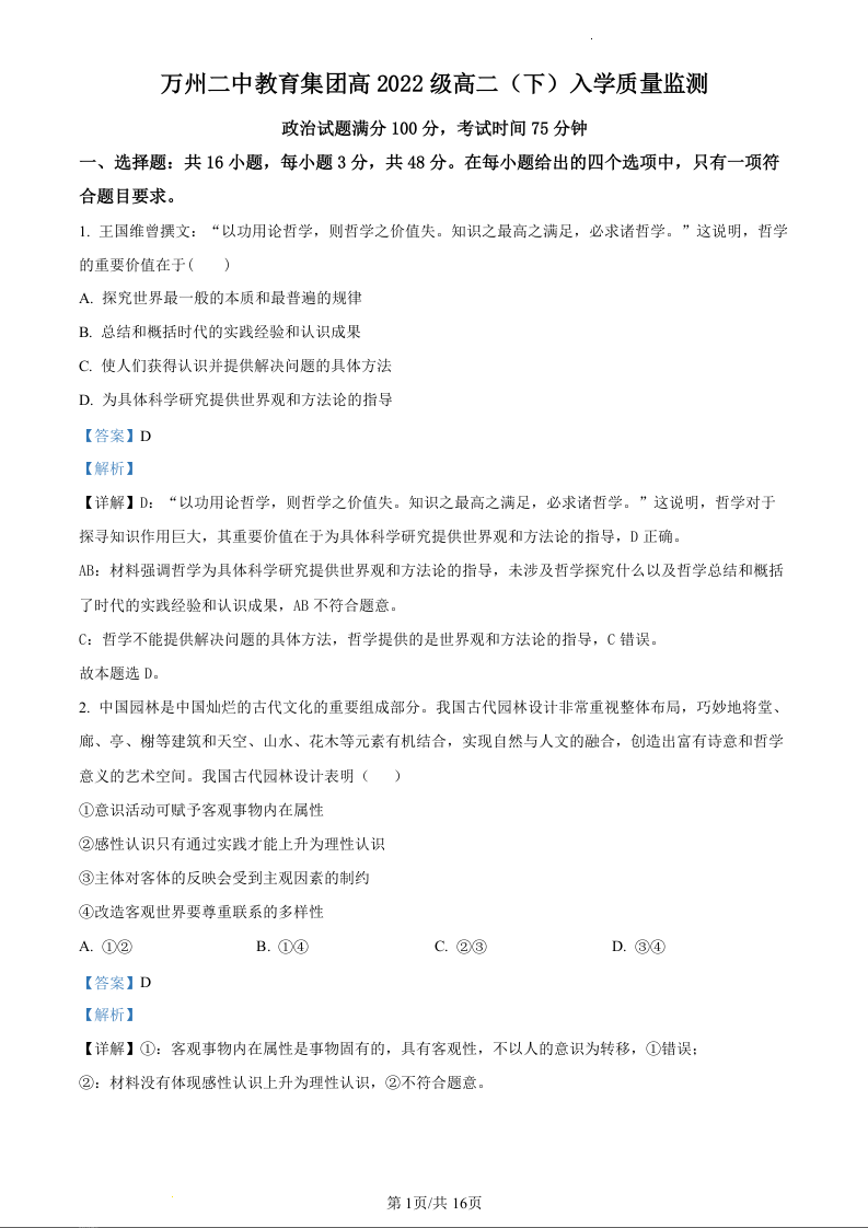 重庆市万州二中教育集团2023-2024学年高二下学期入学质量监测政治(精品解析版)