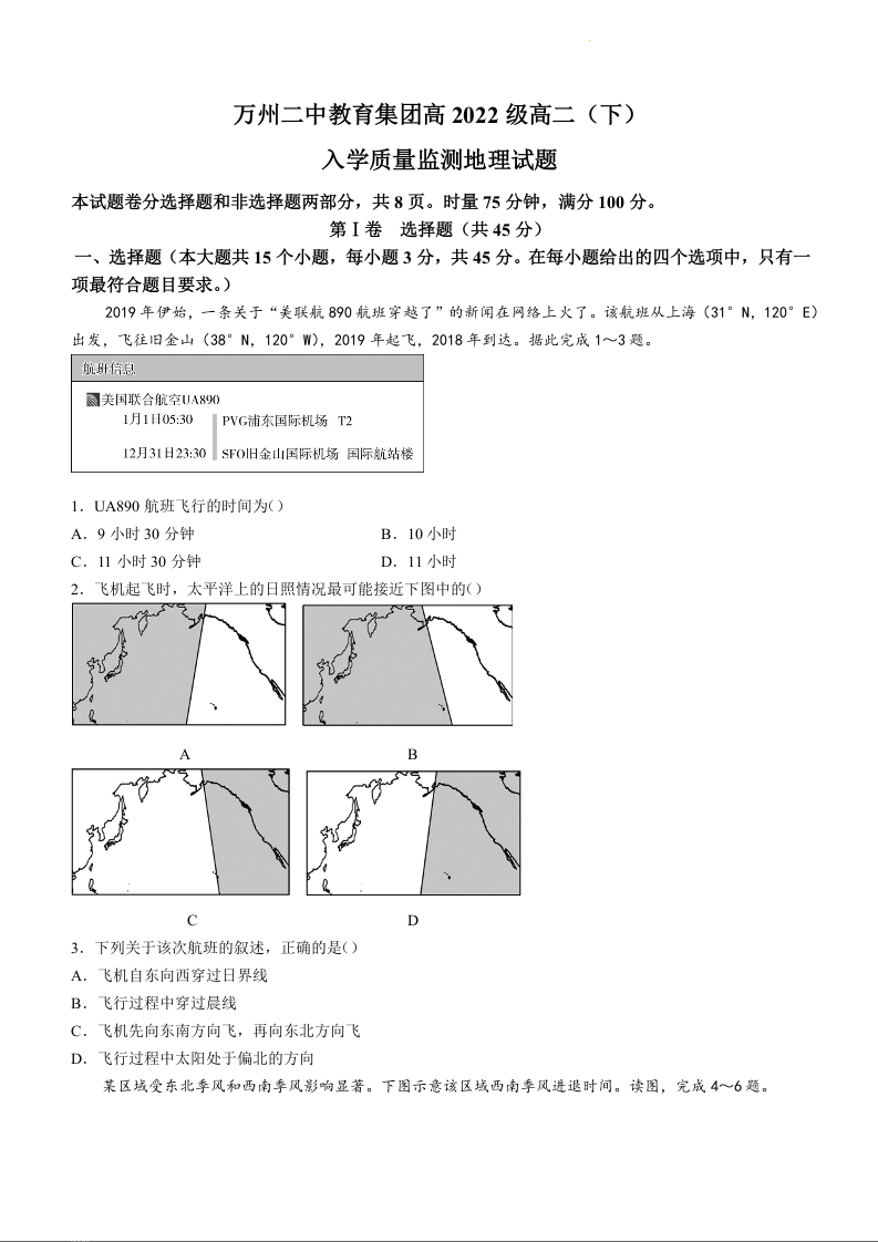 重庆市万州二中教育集团2023-2024学年高二下学期入学质量监测地理