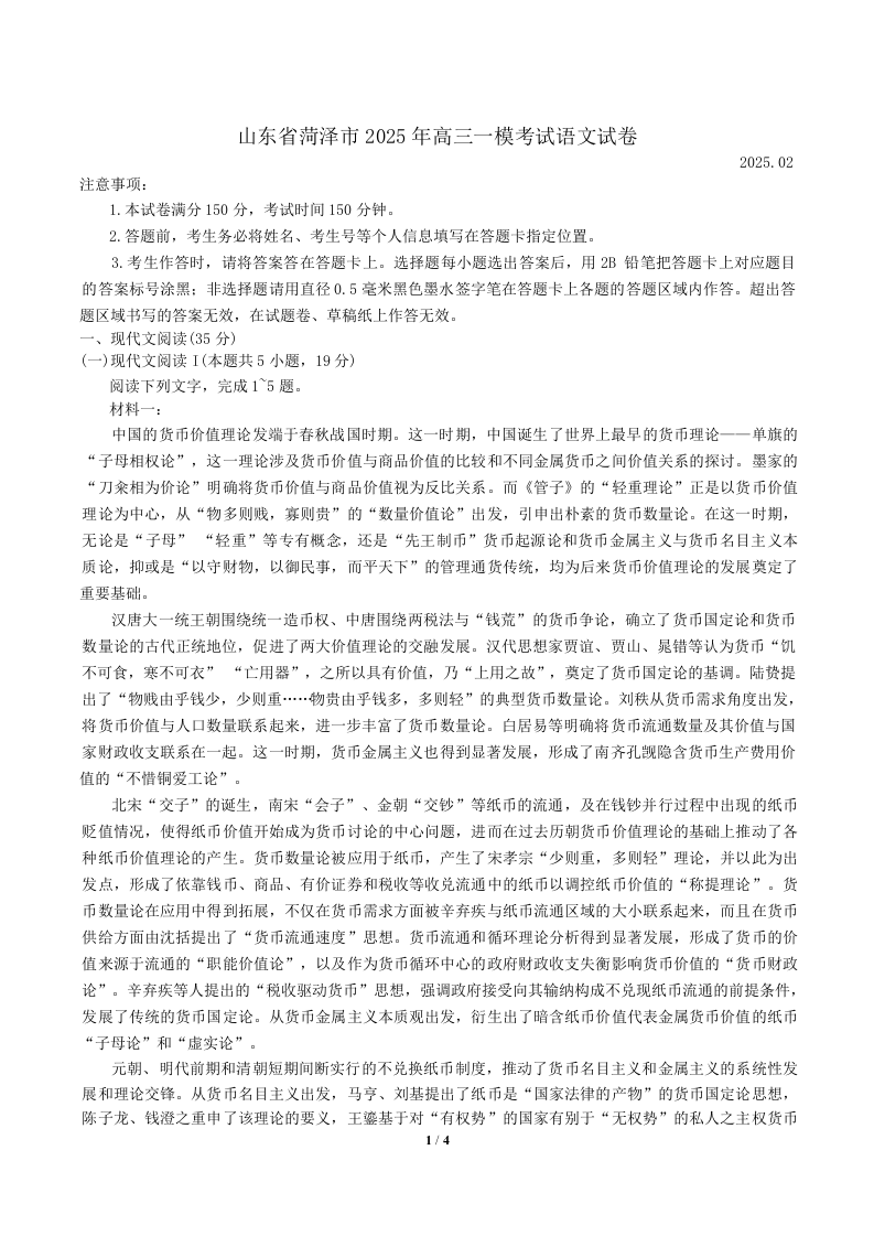 山东省菏泽市2024-2025学年高三第一次模拟考试语文+答案