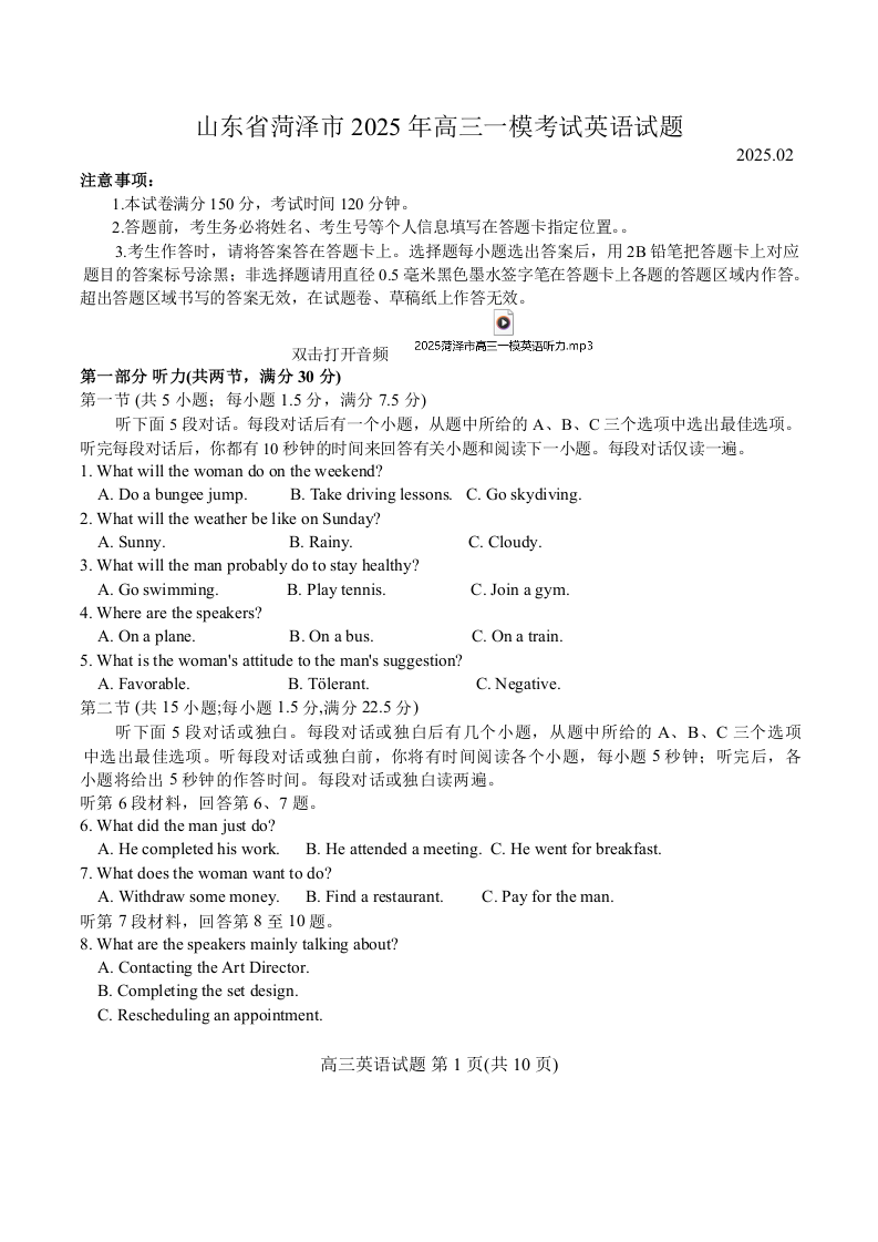 山东省菏泽市2024-2025学年高三第一次模拟考试英语+答案