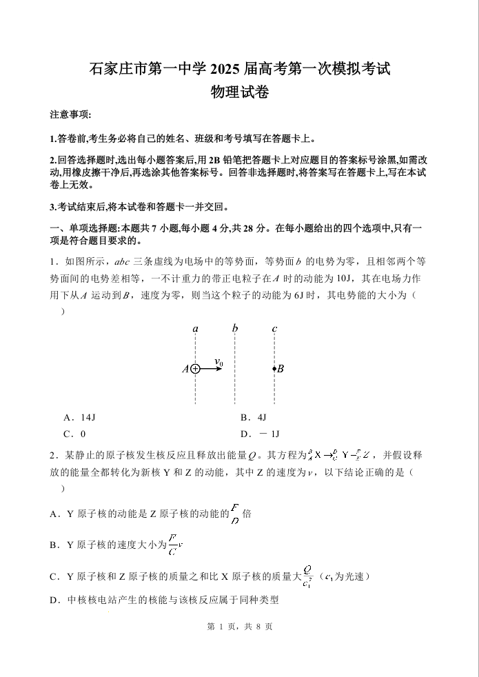 河北省石家庄一中2024-2025学年高考第一次模拟考试物理