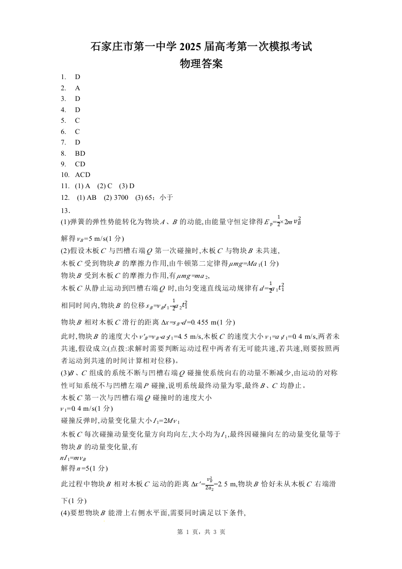 河北省石家庄一中2024-2025学年高考第一次模拟考试物理答案