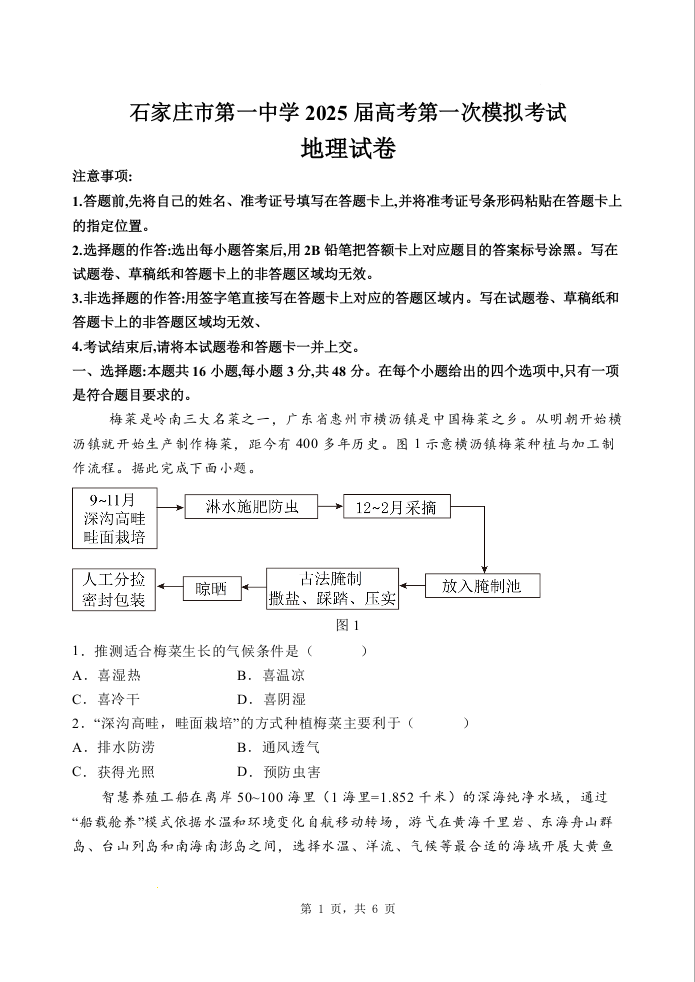 河北省石家庄一中2024-2025学年高考第一次模拟考试地理