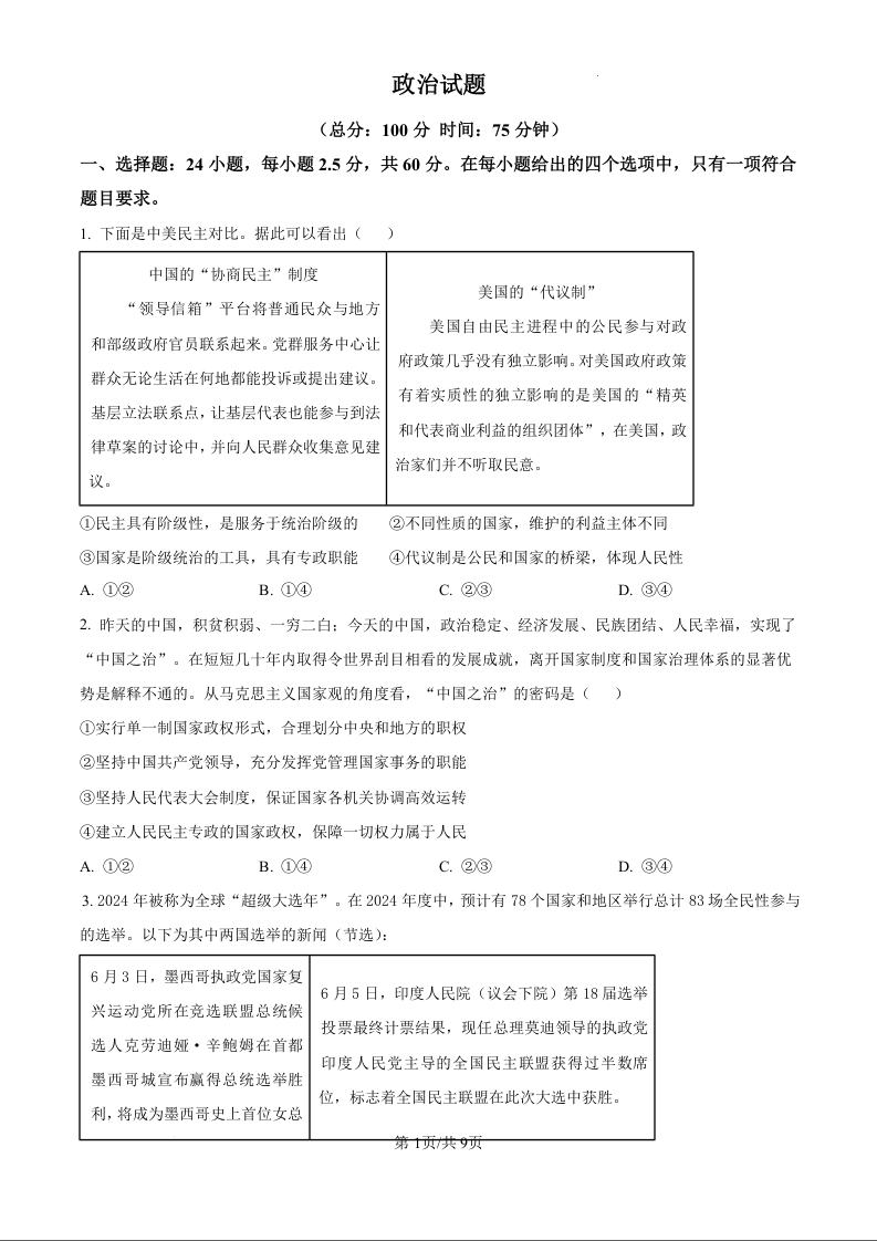 重庆市巴蜀中学2024-2025学年下学期高二开学考试政治(原卷版)