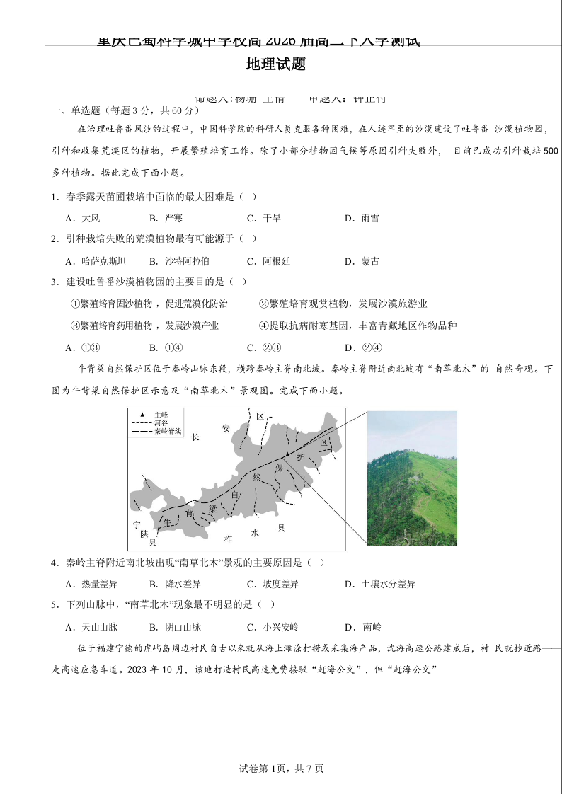 重庆市巴蜀中学2024-2025学年下学期高二开学考试地理