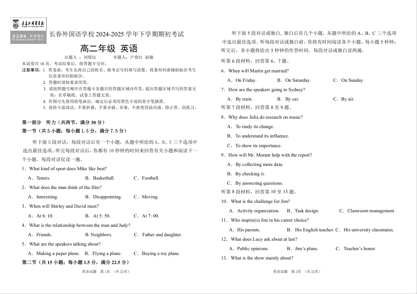 吉林省长春市外国语学校2024-2025学年下学期高二开学考试英语+答案