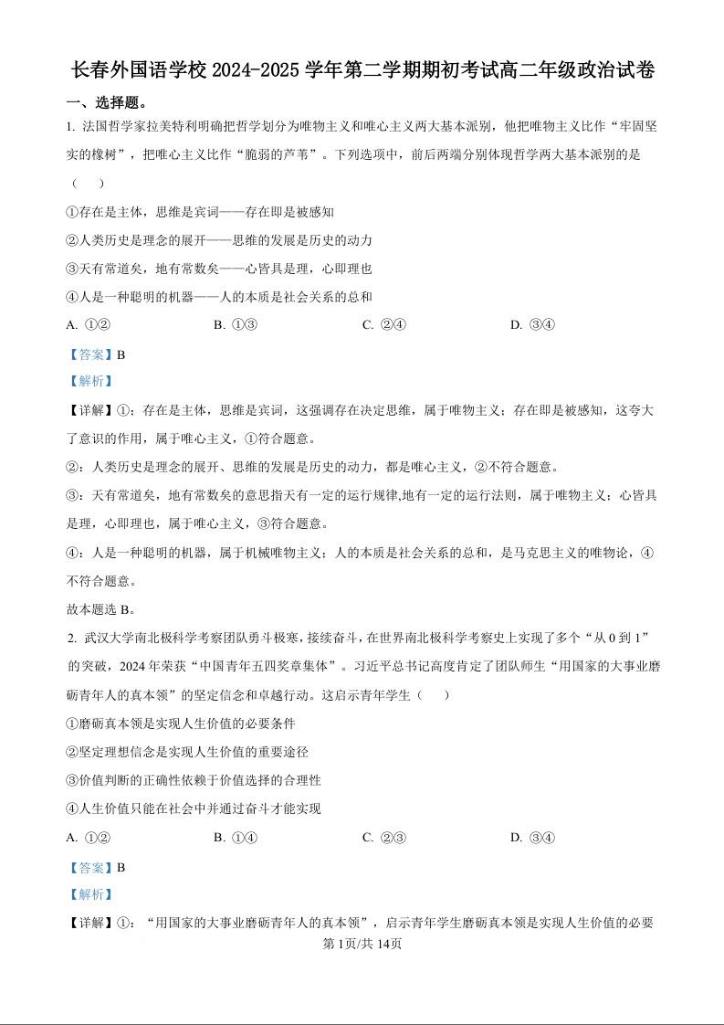吉林省长春市外国语学校2024-2025学年下学期高二开学考试政治(解析版)