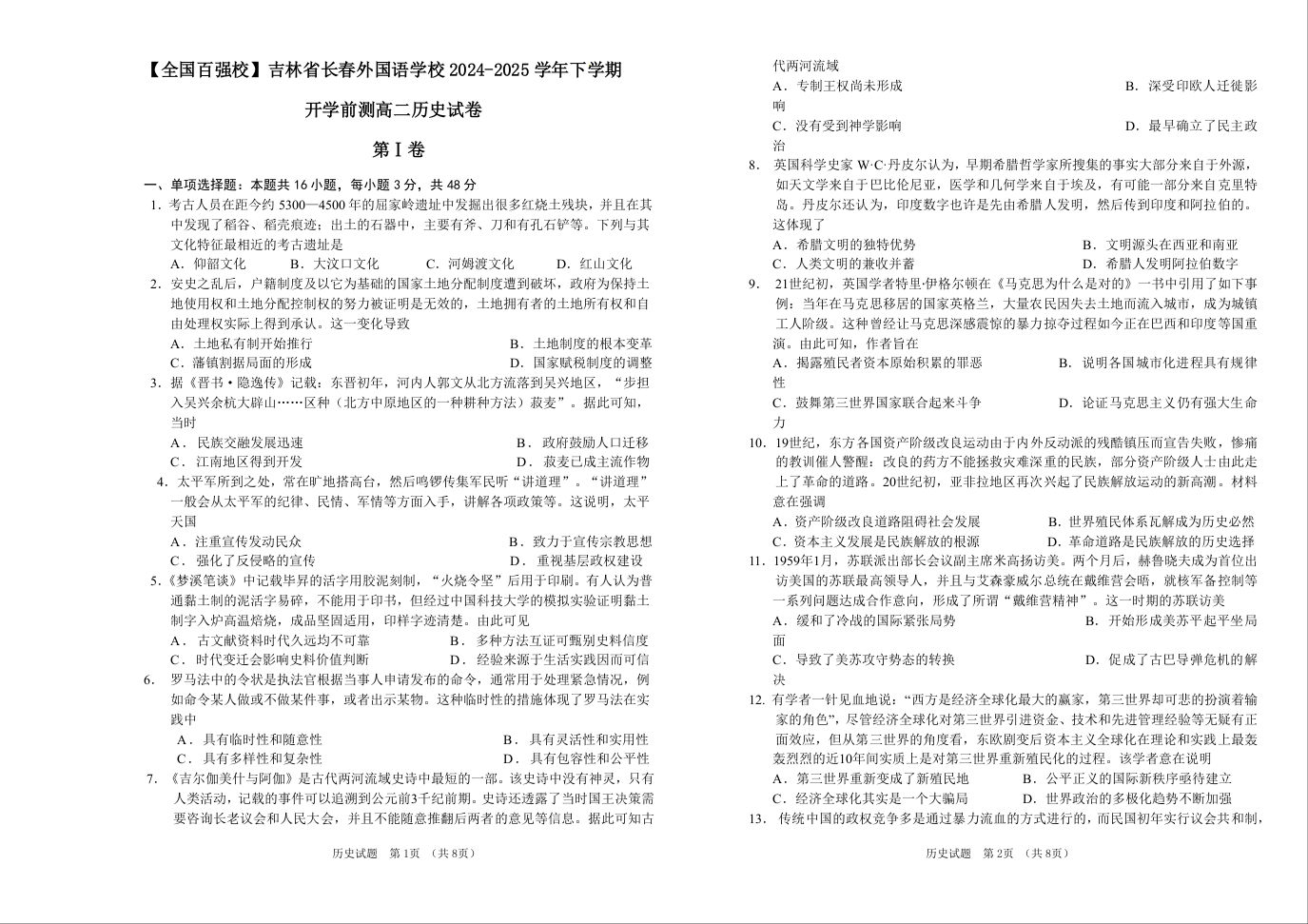 吉林省长春市外国语学校2024-2025学年下学期高二开学考试历史+答案
