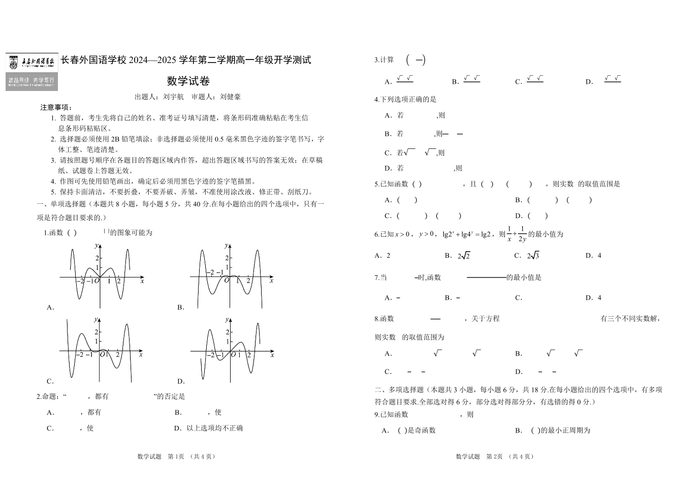 吉林省长春市外国语学校2024-2025学年下学期高一开学考试数学+答案