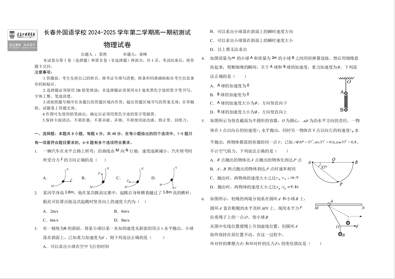 吉林省长春市外国语学校2024-2025学年下学期高一开学考试物理+答案