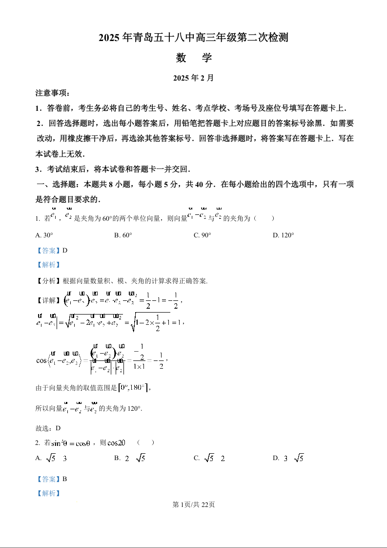 山东省青岛第五十八中2024-2025学年下学期高三第二次检测数学(精品解析版)