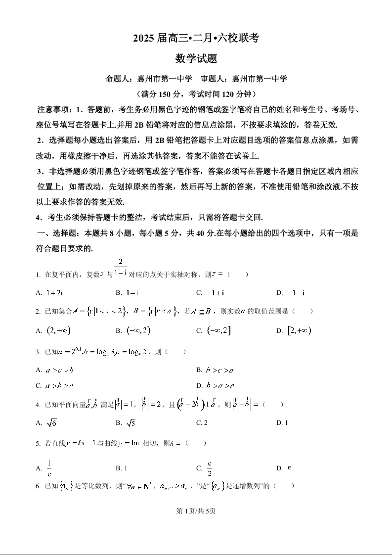广东省惠州市一中等六校2024-2025学年下学期2月高三联考数学数学(原卷版)