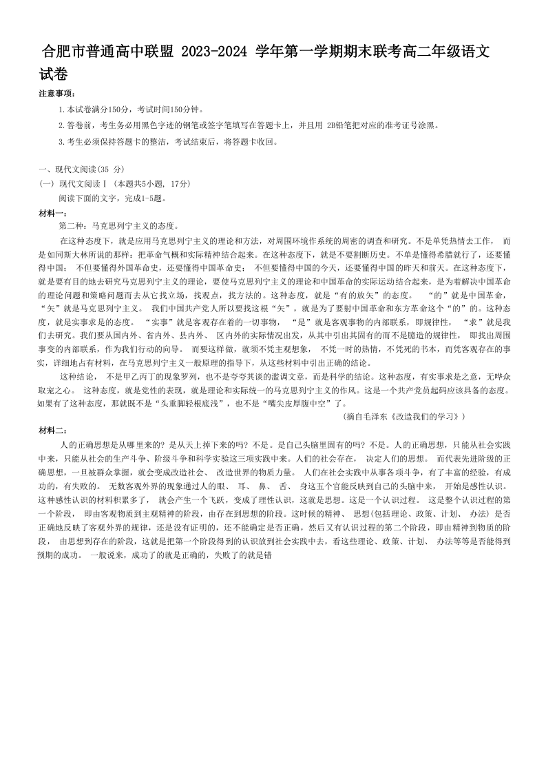 安徽省合肥市六校联盟2023-2024学年高二上学期1月期末考试语文+答案