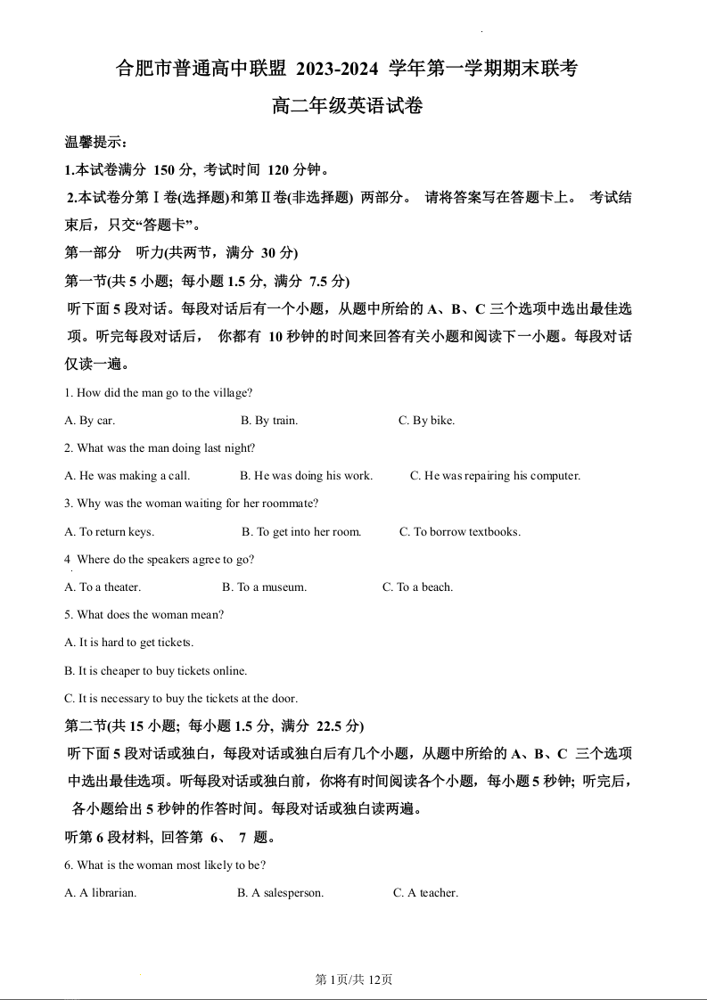 安徽省合肥市六校联盟2023-2024学年高二上学期1月期末考试英语(原卷版)