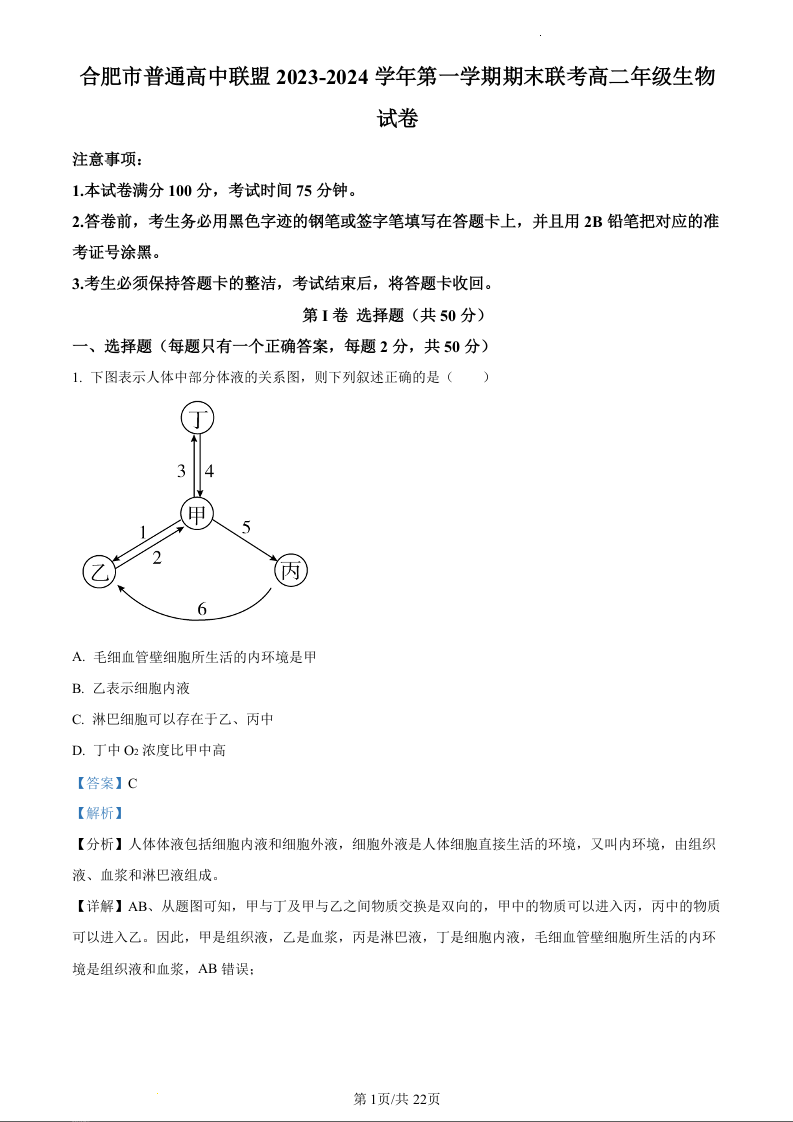 安徽省合肥市六校联盟2023-2024学年高二上学期1月期末考试生物(精品解析版)
