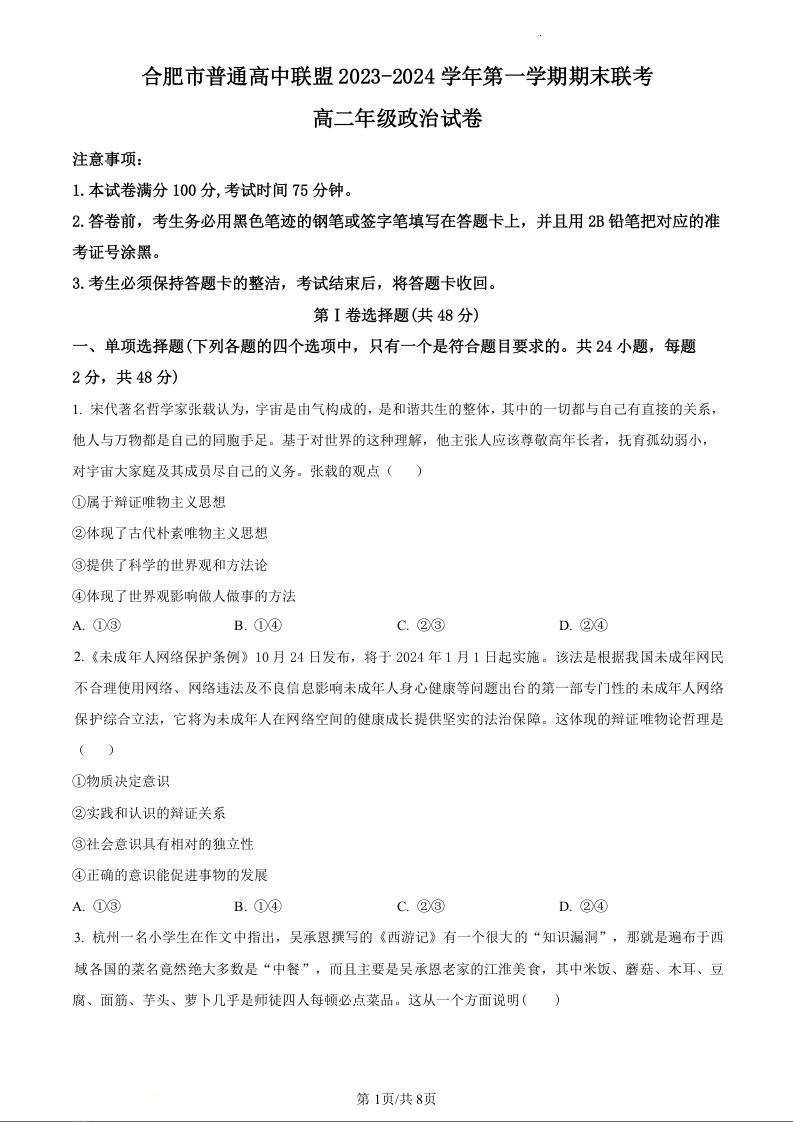 安徽省合肥市六校联盟2023-2024学年高二上学期1月期末考试政治(原卷版)