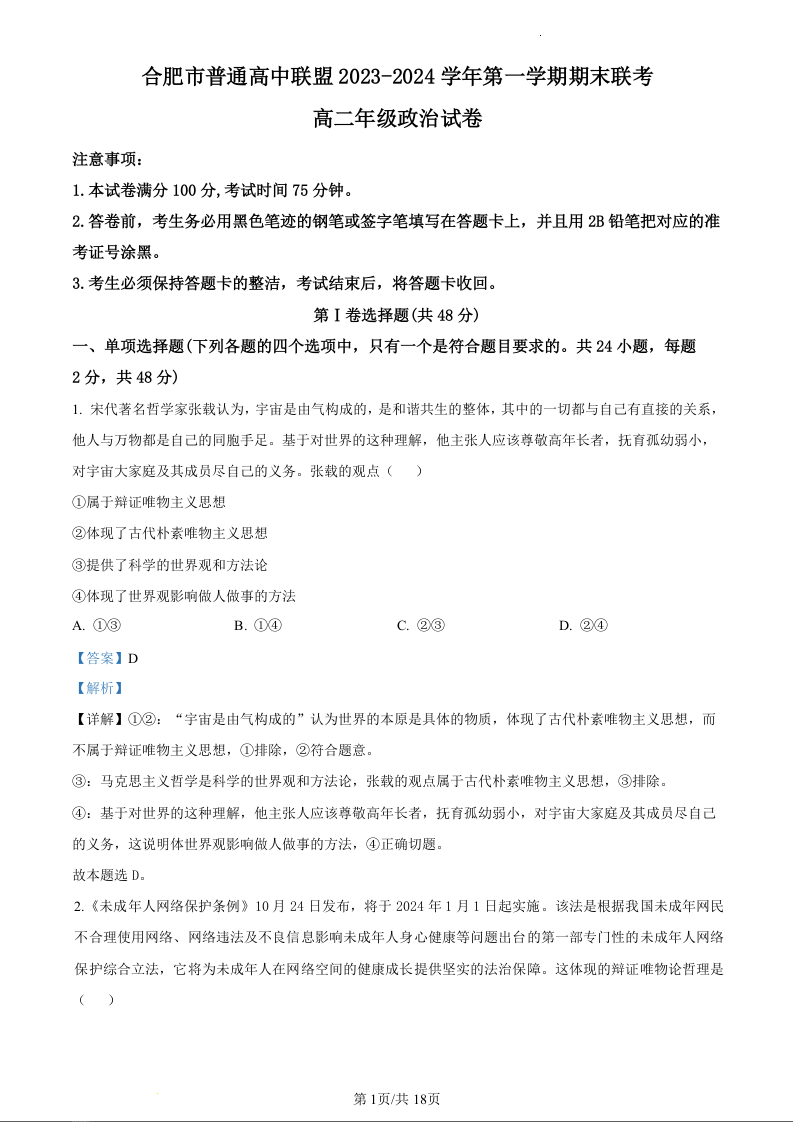 安徽省合肥市六校联盟2023-2024学年高二上学期1月期末考试政治(精品解析版)
