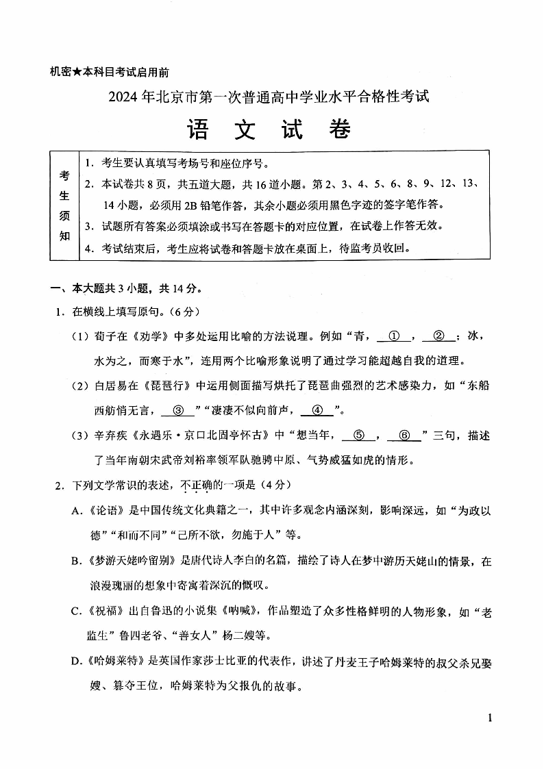 2024年北京市第一次普通高中学业水平合格性考试语文+答案