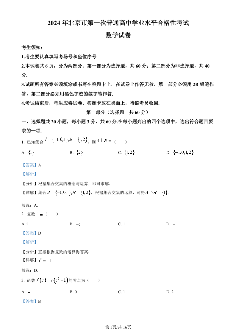 2024年北京市第一次普通高中学业水平合格性考试数学(精品解析版)