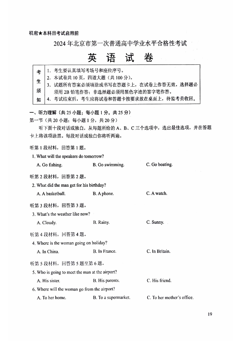 2024年北京市第一次普通高中学业水平合格性考试英语+答案