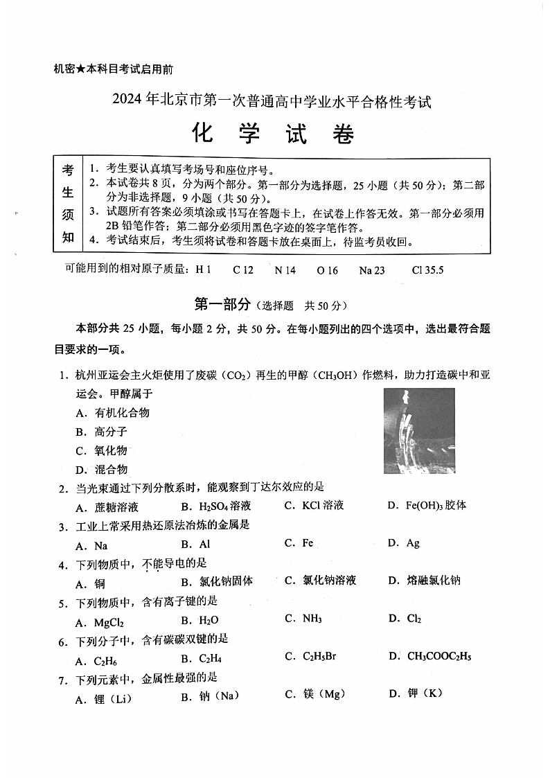 2024年北京市第一次普通高中学业水平合格性考试化学+答案