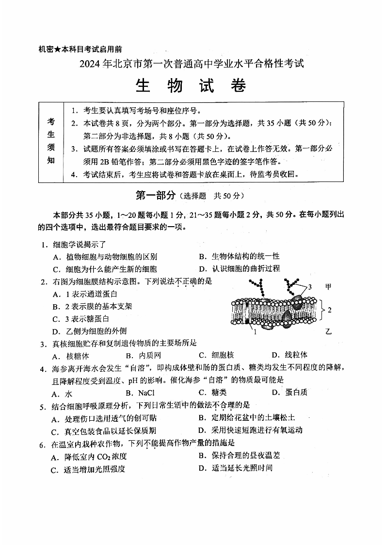 2024年北京市第一次普通高中学业水平合格性考试生物+答案