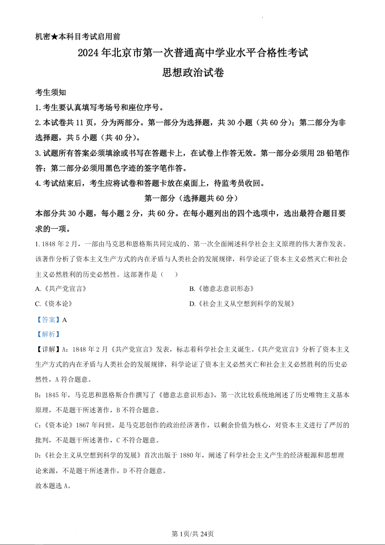2024年北京市第一次普通高中学业水平合格性考试政治(精品解析版)