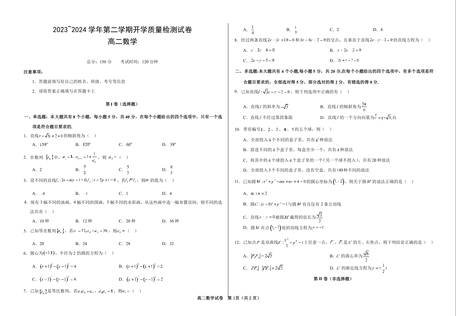 甘肃省武威市凉州区2023-2024学年高二下学期开校质量检测数学