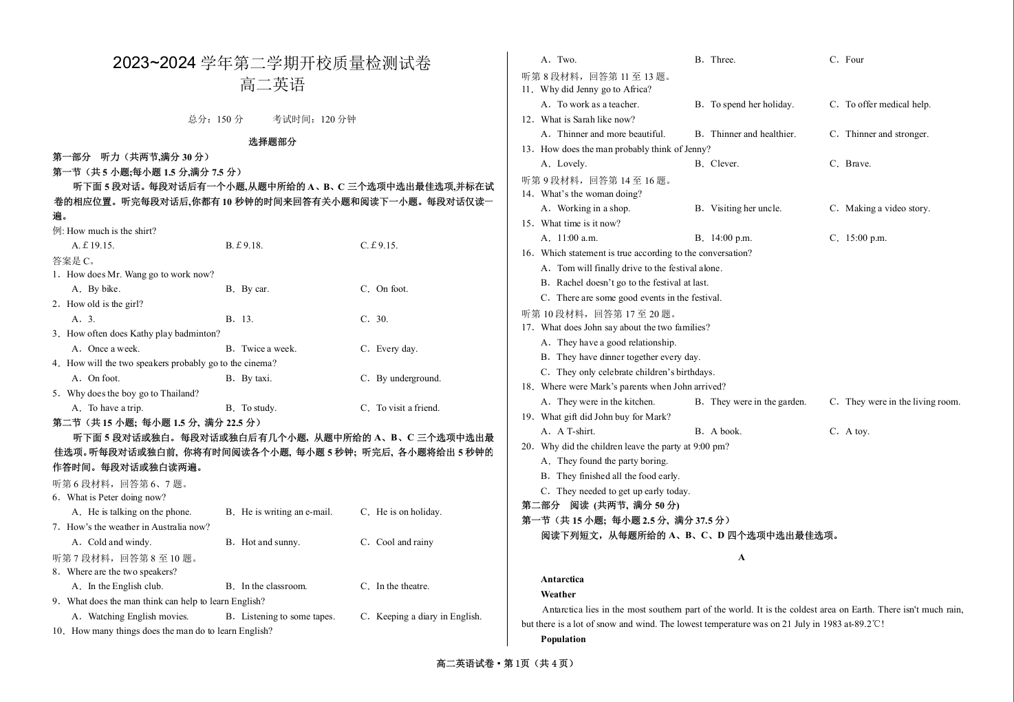 甘肃省武威市凉州区2023-2024学年高二下学期开校质量检测英语