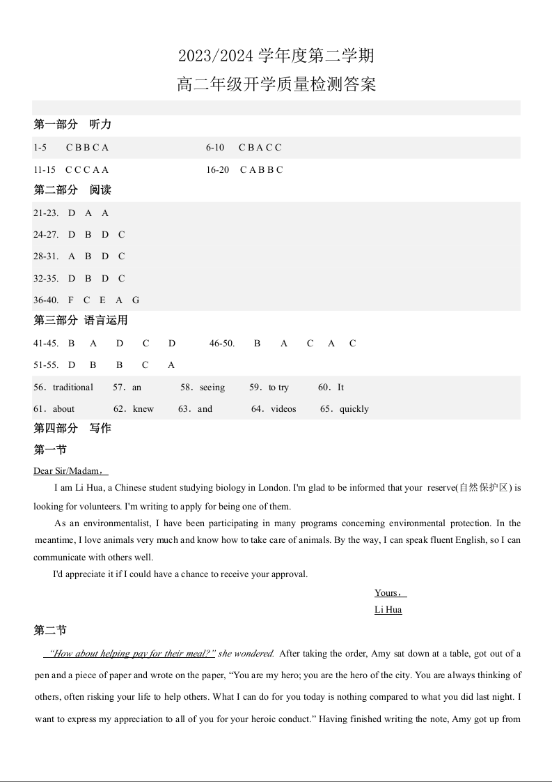 甘肃省武威市凉州区2023-2024学年高二下学期开校质量检测英语答案