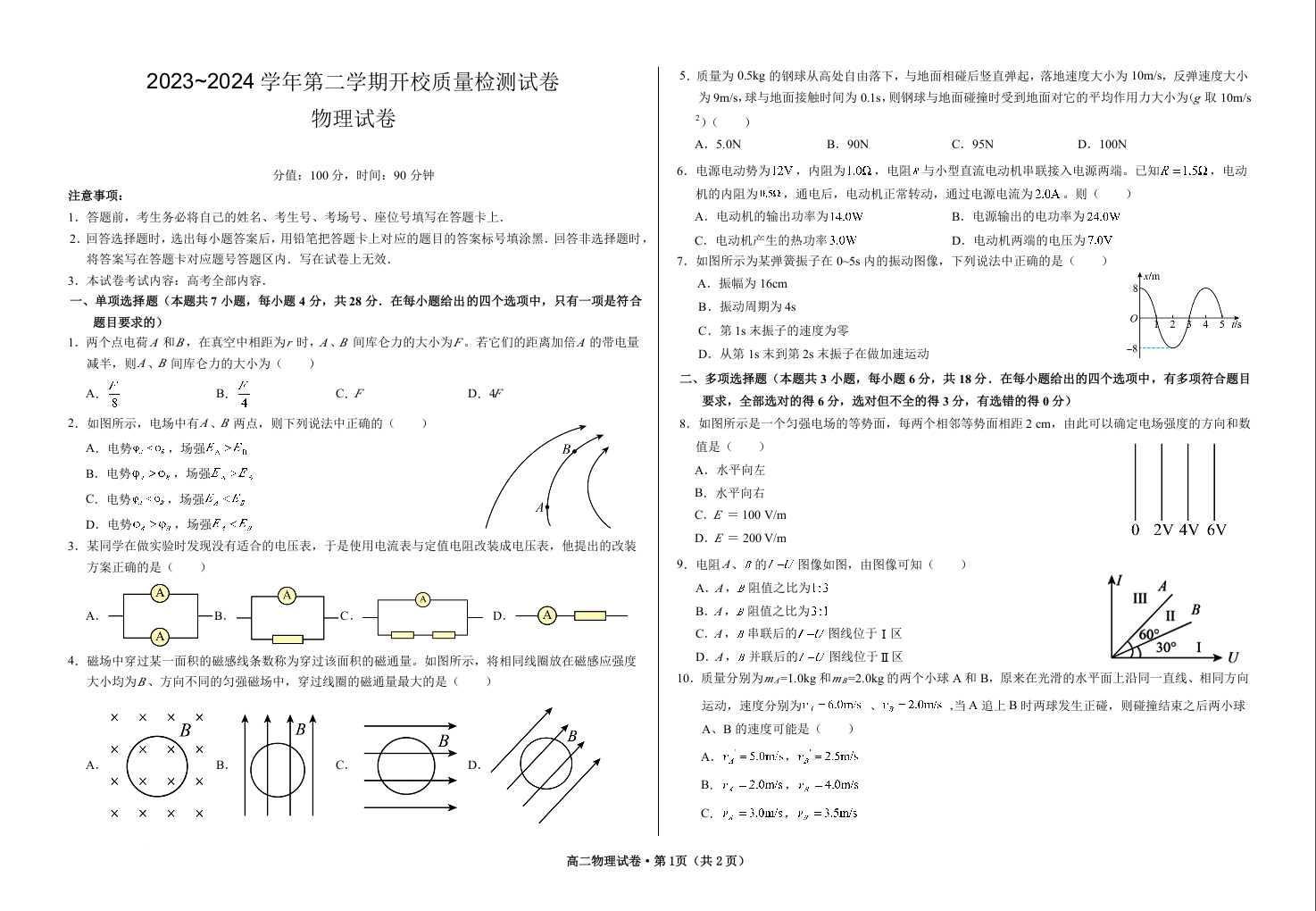 甘肃省武威市凉州区2023-2024学年高二下学期开校质量检测物理