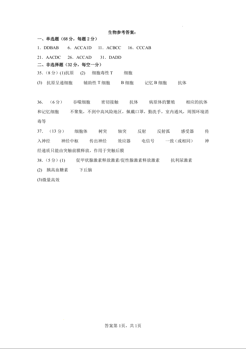 甘肃省武威市凉州区2023-2024学年高二下学期开校质量检测生物答案