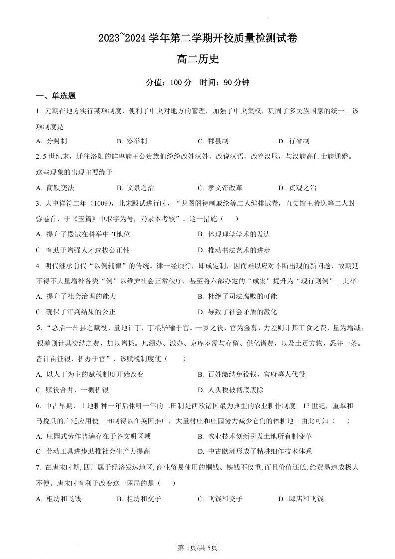 甘肃省武威市凉州区2023-2024学年高二下学期开校质量检测历史(原卷版)