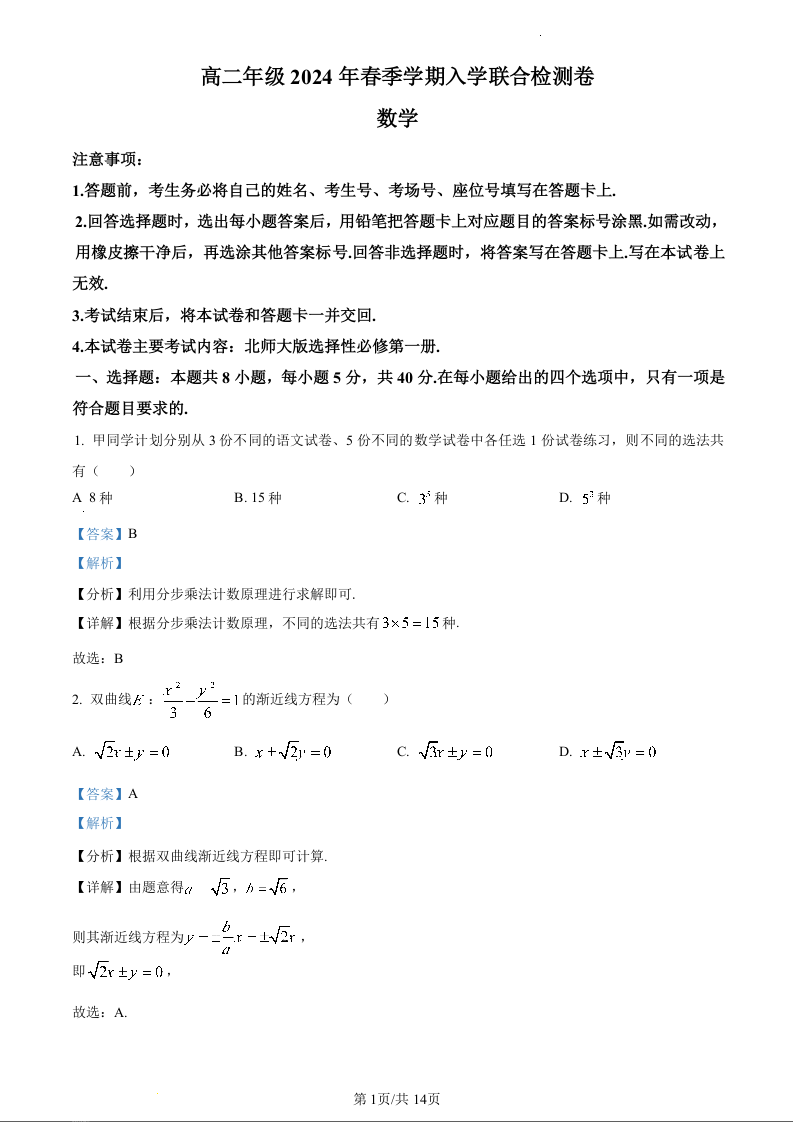 广西壮族自治区桂林市联考2023-2024学年高二下学期开学考试数学(精品解析版)
